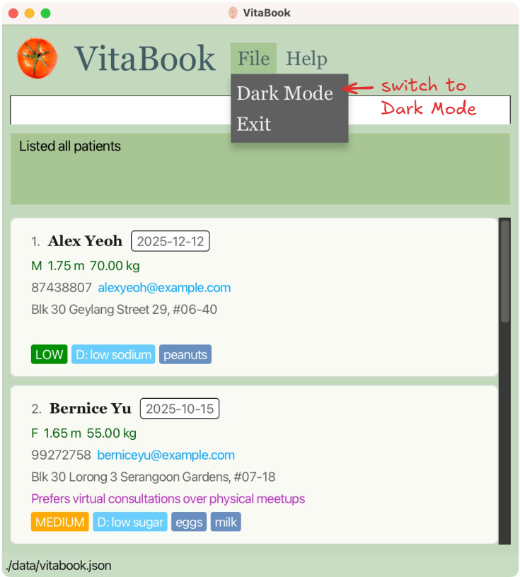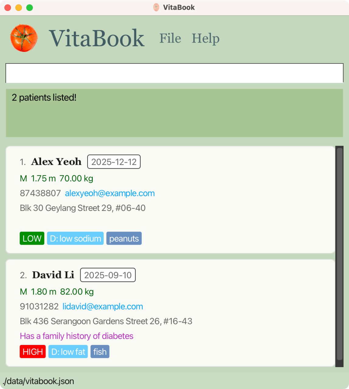 add n/John Doe g/m h/1.78 w/70.00 no/98765432 e/johnd@example.com a/John Street block 123, #01-01 d/low sodium pr/LOW m/2025-01-25 adds a new patient John Doe.add n/Betsy Crowe e/betsycrowe@example.com g/f a/Newgate Prison h/1.68 w/50.00 no/97867564 d/low fat pr/MEDIUM m/2025-02-24 al/peanuts al/milk adds a new patient Betsy Crowe.list 📋Shows a list of all the patients in your VitaBook.
