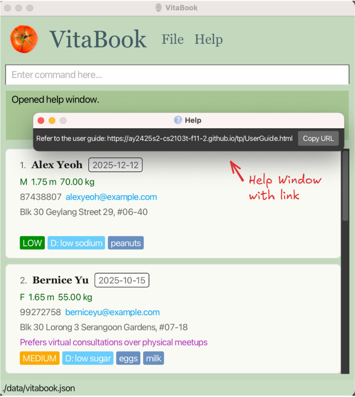 Welcome to VitaBook — your go-to desktop companion made just for freelance nutritionists in Singapore. Whether you're juggling patient records, planning meal guides, or sorting through dietary preferences, VitaBook’s got your back. It blends the speed of a Command Line Interface (CLI) with the simplicity of a Graphical User Interface (GUI), so you can breeze through admin work and get back to what you do best: helping people eat better and live healthier.
